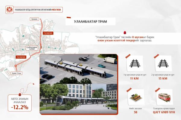 Нийтийн тээврийн Улаанбаатар Трам төслийн хоёрдугаар шугамын бүтээн байгуулалтын ажлын гүйцэтгэгчийг сонгон шалгаруулах нээлттэй тендерийг өнөөдөр зарлаж, тендерийн материал хүлээн авч эхэллээ. Улаанбаатар Трам төслийн хоёрдугаар шугам нь Сүхбаатарын талбайгаас Буянт-Ухаа цогцолбор хүртэл 15 км үргэлжилж, 23 зогсоолтой байна. Нисэхийн бүсийг хотын төвтэй холбох Улаанбаатар Трам төслийн хоёрдугаар шугамыг 2026-2028 онд барьж дуусгах юм. Оролцогчдын тендерийн баримт бичгийг 2026 оны дөрөвдүгээр сарын 15-ны өдрийн 11 цаг 00 минутаас өмнө тендер шалгаруулалтын баримт бичигт зааснаар хүлээн авна. Тендерийг дөрөвдүгээр сарын 15-ны өдрийн 11 цаг 40 минутад нээнэ. Төслийн нийт төсөвт өртөг 1.2 их наяд төгрөг бөгөөд 2026 онд санхүүжих дүн 325 тэрбум төгрөг байна. Тендер нь EPC (Engineering, Procurement, Construction) нөхцөлтэй. Гүйцэтгэгч нарийвчилсан зураг төсөл боловсруулах, тоног төхөөрөмж, материалын худалдан авалт хийх, барилга угсралтын ажлыг бүрэн хариуцах юм.
