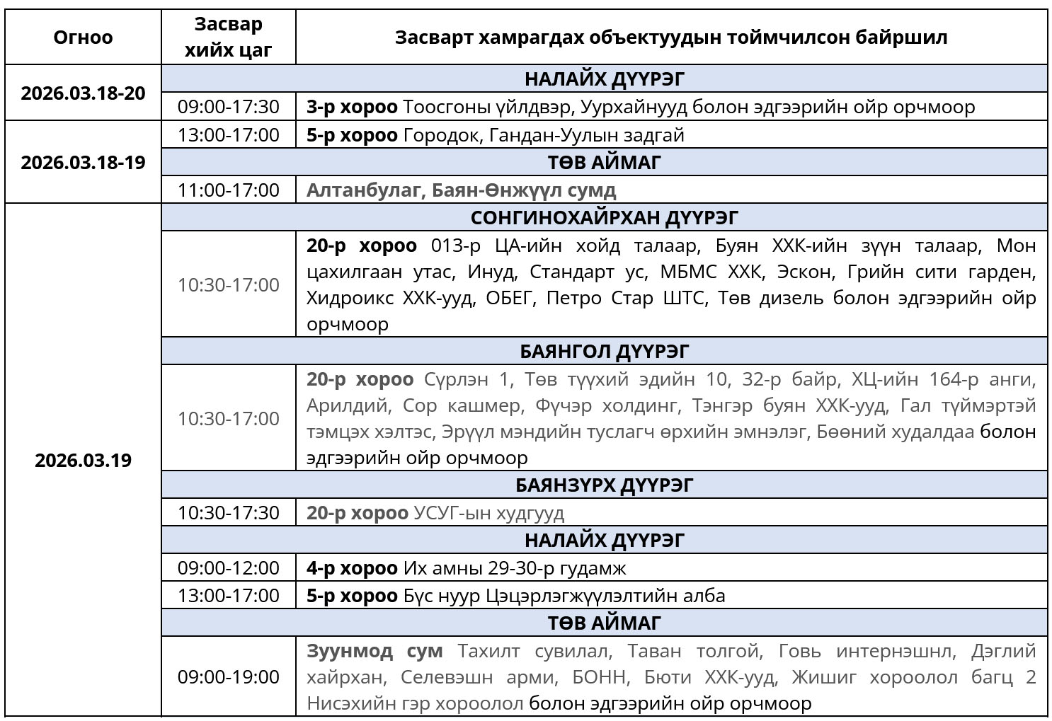УБЦТС: Өнөөдөр цахилгаан шугам тоноглолд хийгдэх засвар үйлчилгээний хуваарь