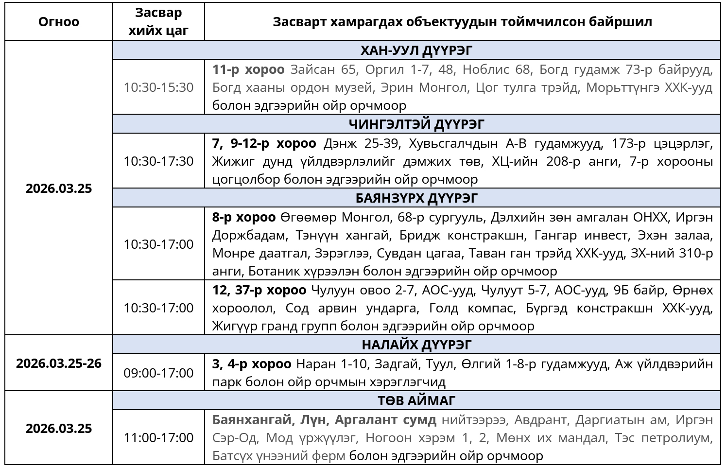 ЖИЧ: Цаг агаарын нөхцөл байдлаас шалтгаалан хуваарьт өөрчлөлт орвол, гэрээт бүртгэлтэй утасны дугаарт мэдээлэл хүргэх болно. Засварын ажлыг тухайн тоноглолоос хүчдэлээс бүрэн чөлөөлсний дараа хийдэг нөхцөл байдлыг харгалзан үзэж, хүлээцтэй хандахыг хэрэгчлэгч та бүхнээс хүсье.