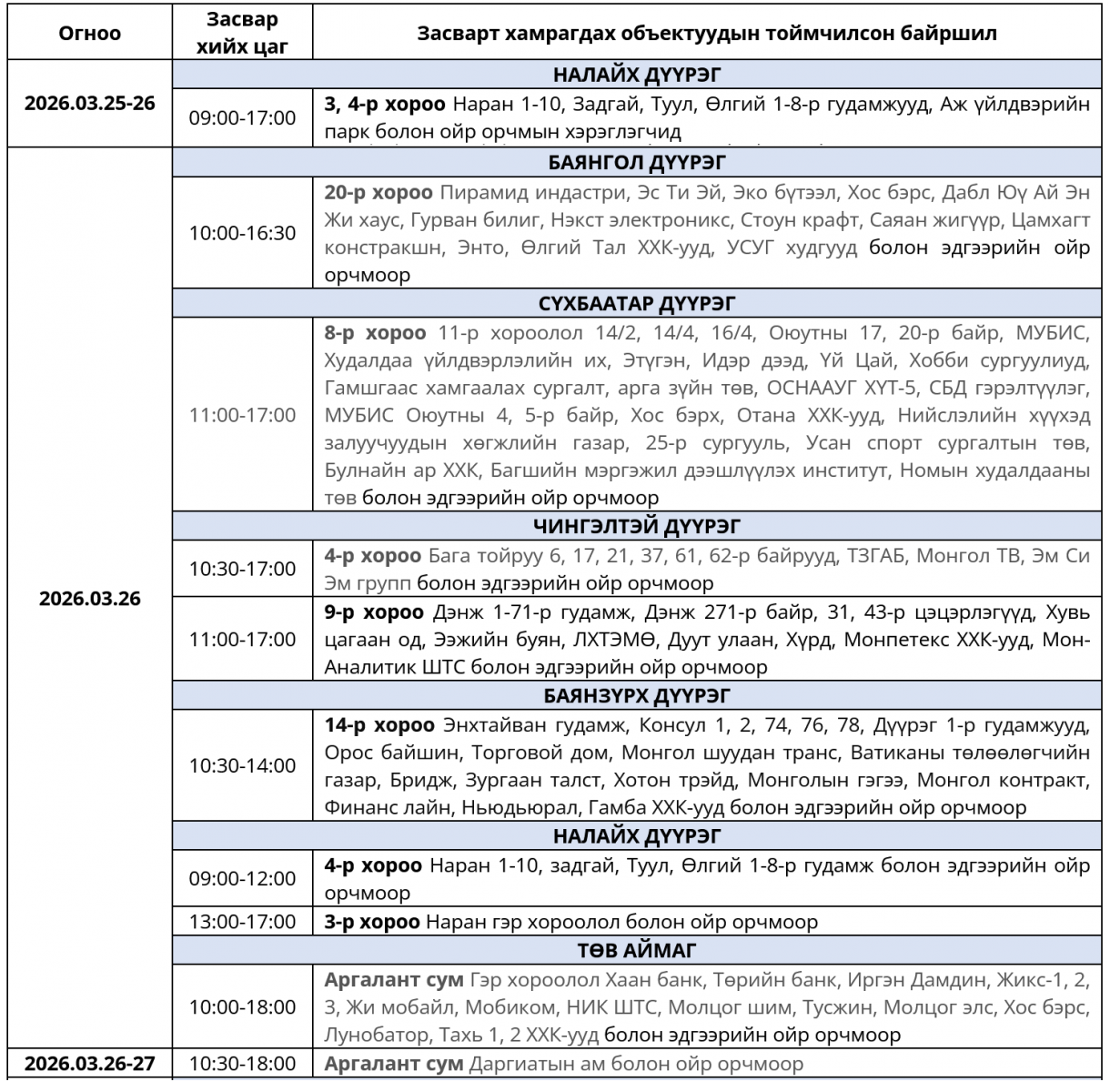 Өнөөдөр буюу 2026 оны гуравдугаар сарын 26-ны Пүрэв гарагт цахилгаан шугам сүлжээнд хийх засварын хуваарийг танилцуулж байна.