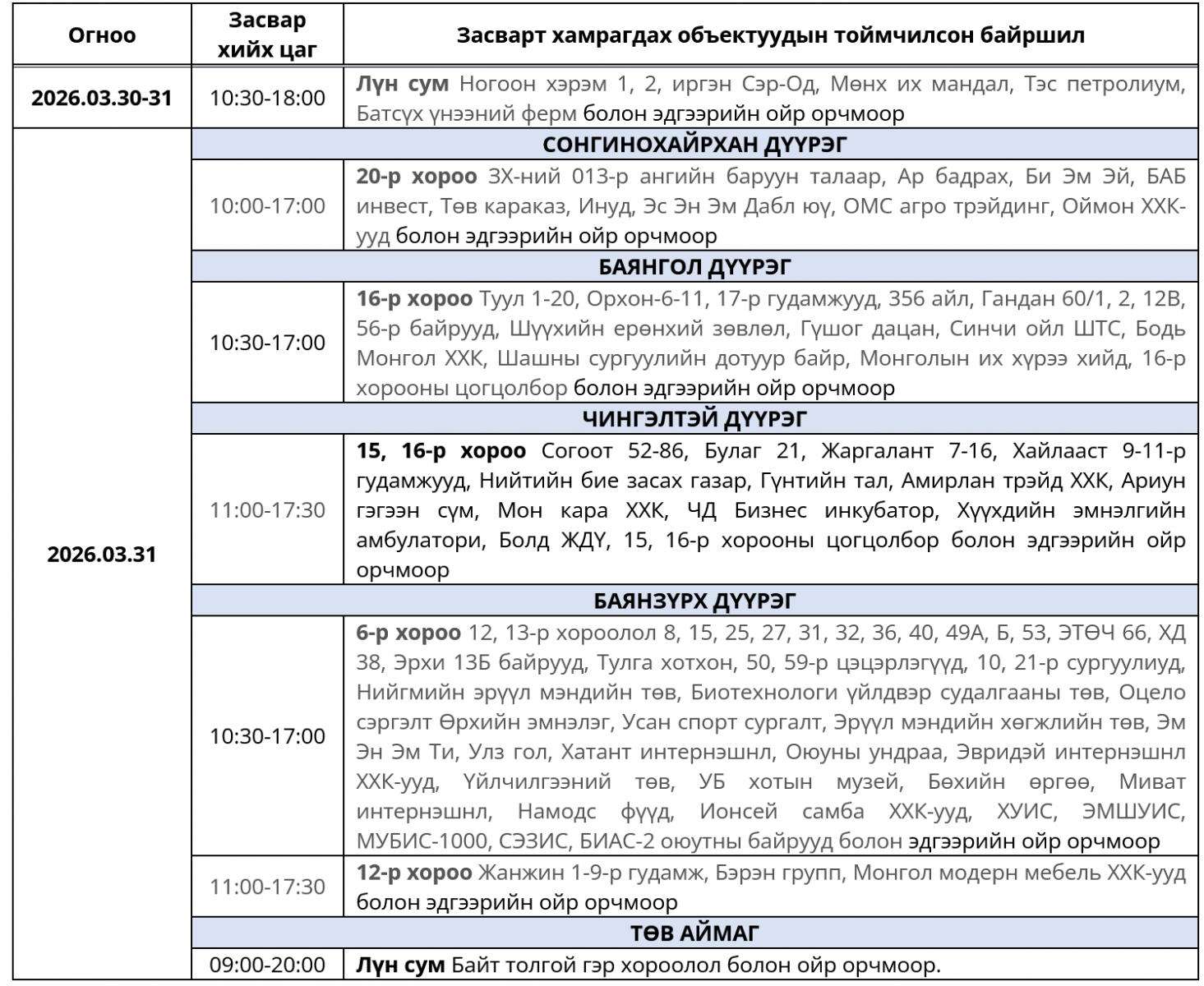 ЖИЧ: Цаг агаарын нөхцөл байдлаас шалтгаалан хуваарьт өөрчлөлт орвол, гэрээт бүртгэлтэй утасны дугаарт мэдээлэл хүргэх болно. Засварын ажлыг тухайн тоноглолоос хүчдэлээс бүрэн чөлөөлсний дараа хийдэг нөхцөл байдлыг харгалзан үзэж, хүлээцтэй хандахыг хэрэгчлэгч та бүхнээс хүсье.